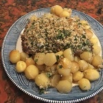 ... разрезаем картофель пополам (можно это было сделать и заранее, но мне сначала хотелось запечь её целиком, а потом оказалось, что картошка моя очень разваривается, и я её разрезала), кладём на противень к мясу. Сразу перемешиваем с мясным соком.