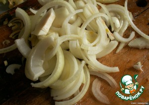• В сковороду добавить сливочное масло, обжаривать лук примерно 3 минуты до золотистого цвета.