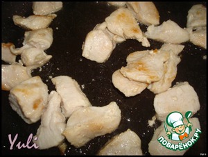 Мясо курицы нарезать небольшими кусочками,обжарить на растительном масле до золотистой корочки.