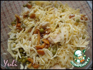 Сыр натереть на крупной терке.Рекомендую брать сыр сливочных сортов,не с ярко выраженным вкусом,т.к. в салате его много,не нужно,чтобы он перебивал другие компоненты.