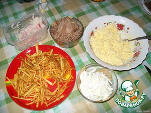 Картофель нарезать тонкой соломкой и обжарить на растительном масле. Выложить на тарелку и подсолить. Что бы картофель оставался таким же хрустящим, салат надо смешивать непосредственно перед подачей и быстро съедать :-) Но об этом просить не придется ;-)