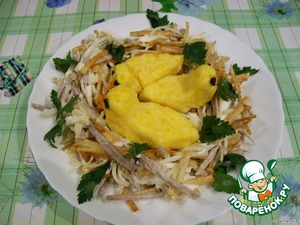 На сайте много рецептов всяких разных «Гнездышек», но все они разные. А я уже лет пять делаю Гнездышко, которое каждый раз торжественно занимает центр стола, меняется только оформление. Прошу прощения если повторюсь, но мне кажется такого именно рецепта нет. Вкусно и красиво!