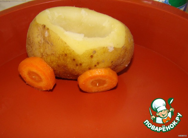 Морковь порежем на пластики примерно 5 мм шириной .и с помощью шпажек прикрепляем с четырех сторон картофеля.(Колеса)))