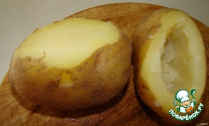 Картофель отварим до полуготовности ,срежем верхнюю часть и ложкой или ножом вырезаем серединку.