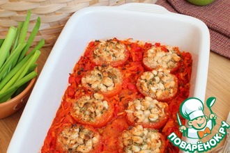 Фаршируем картофель предварительно посолив и поперчив внутри и облив немного растительным маслом...затем посыпьте картоферь панировочными сухарями . Начинку которая осталась выкладываем в форму..И запекаем 30-40 минут при температуре 200(Время зависит от величины картофеля)Если вы не поститесь то за 5 минут до окончания приготовления можно положить по чайной ложке сметаны сверху и посыпать сыром