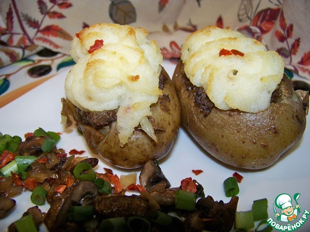Ничего особенного. Картофель запеченный , фаршированный грибами. А вот вариант подачи может быть кому и пригодится. В надежде на это и выкладываю рецепт!На конкурс "Постимся с "Moulinex""