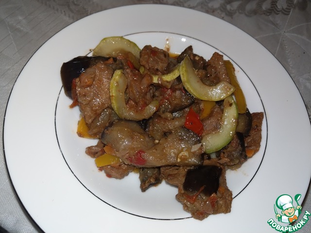 Мясо в овощном соусе с баклажанами и кабачком.
