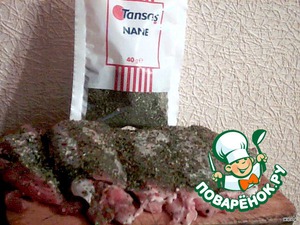 Разделываем ножку, удаляем кость и вырезаем сухожилия. Готовим рассол: соль и специи разводим в воде и ставим кипятить. Плотность рассола проверяем сырым яйцом. Яицо должно всплывать как говорят на "5 копеек" -т. е. чуть над рассолом.. Укладываем наше мясо в посуду и на сутки оставляем на столе. После того обсушиваем бумажными полотенциями. Обваливаем в пряностях, Состав не знаю -индийская, Но с явным привкусом мяты.