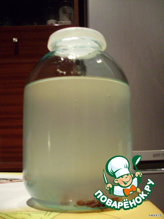 Добавить сахар, изюм, лимон - на 1 литр нужно-15 грамм сахара,4шт изюма, 1\\\\10 часть лимона. Закрыть посуду, подержать при комнатной температуре 3-5 дней. Затем поместить на холод.