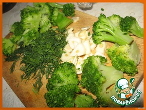 Рубим зелень и чеснок, брокколи разбираем на более мелкие соцветия.
