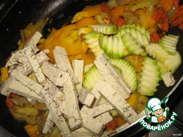 Добавляем кабачок, перец и тофу, обжариваем несколько минут.