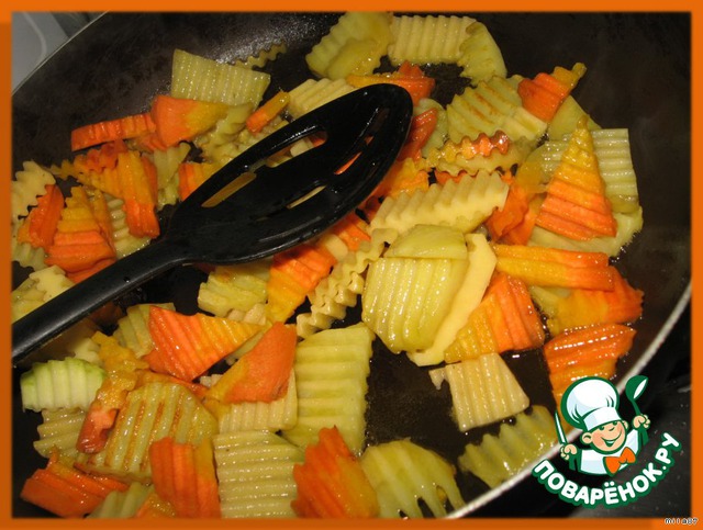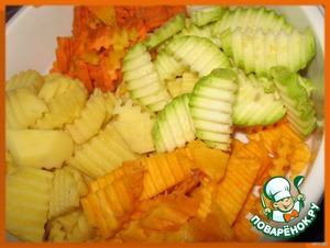 Фигурным ножом режем картофель, морковь, тыкву и кабачок. -