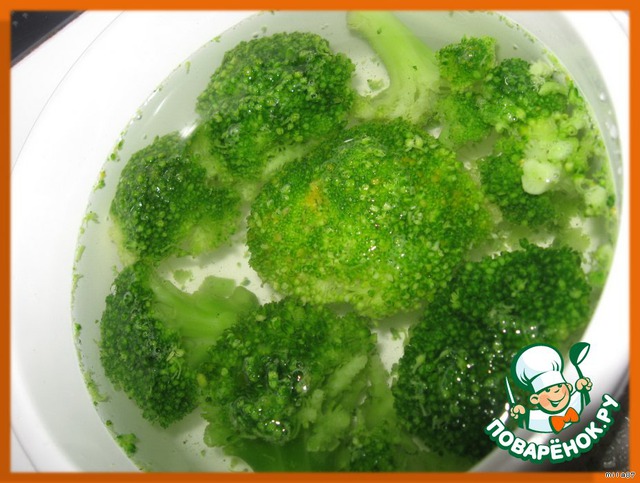 Отвариваем капусту брокколи в течение 5 минут, я просто залила горячей водой и поставила в микро на 3 минуты.