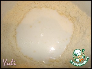 Сделать в центре углубление и влить 120 мл. молока.Замесить мягкое тесто,добавляя при необходимости ещё молока.