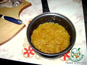 Лук порезать крупными кольцами, положить в маленький сотейник, добавить 3 ложки растительного масла и 3 ложки воды. Присыпать щепоткой соды и поставить тушиться на маленький огонь, до состояния яблочного повидла. В этом и вся ФИШКА, сода расщепляет лук и он приобретает светло коричневый цвет и преподносит необыкновенный аромат и расщепляется до состояния кашки.
