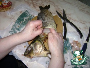 Со стороны брюшка сделать разрез, до позвоночной кости, кость переломить вверх.