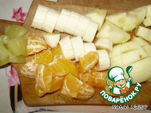 Очищенные от кожуры и семян фрукты, нарезать небольшими кусочками.