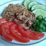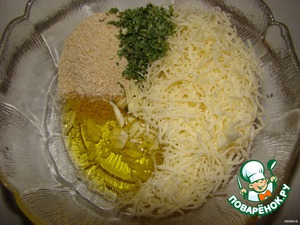 Смешиваем сыр + растительное масло + панировочные сухари + мелко порезанный чеснок + порубленная или сухая зелень.