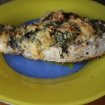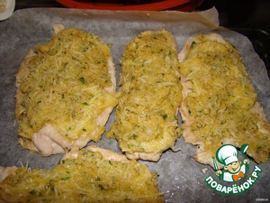 Выкладываем эскалопы на противень и намажем сверху нашей смесью.