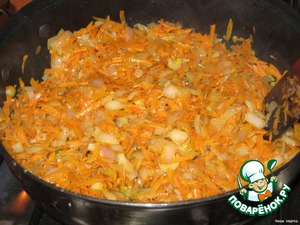 Отдельно обжарить мелко порезанный лук и тертую морковь на растительном масле до золотистого цвета.