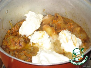 Обжаренные овощи положить в картошку, перемешать и потушить до готовности картофеля. В самом конце добавить сметану и потушить еще 3 минуты.