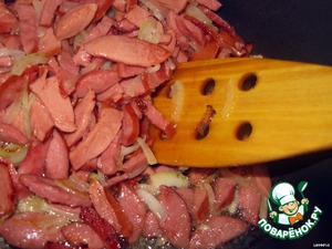 Сардельки или сосиски, либо и то, и другое, также можно добавить любые копчености (как правило, хорошо сочетаются с тушеной капустой) или различные виды мяса, в данном случае, я использовала сардельки, режем соломкой или полукружочками - это не принципиально, главное, чтобы нравилось, и обжариваем с нарезанным полукольцами репчатым луком.