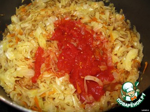 Добавляем в капусту свежий помидор или томат в собственном соку и продолжаем тушить.