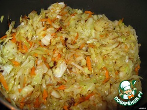 В кастрюле с антипригарным покрытием или в любой другой посудине с высокими стенками обжариваем капусту и морковь до золотистого цвета, солим, затем тушим с добавлением небольшого количества воды до размягчения капустного листа.