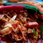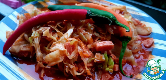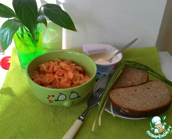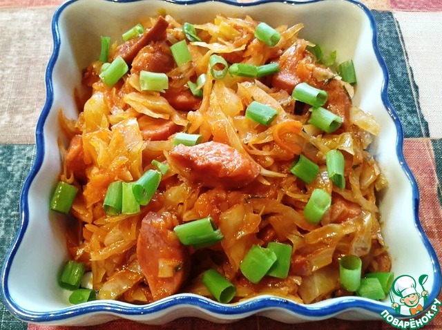 Как только наша капуста "дошла" до предполагаемой готовности, перемешиваем ее с сардельками, которые мы предварительно обжарили с луком и добавляем 1-2 ст.л. томат-пасты или пюре. Сдабриваем специями, кладём лавровый лист, перец горошком и тушим еще 5-7 минут. "Бигос" готов. Подаем "бигос", посыпав зеленью. Приятного аппетита!
