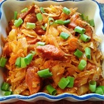 Тушеная капуста с колбасными изделиями.