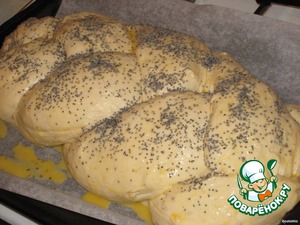 Руки немного смазать растительным маслом, из каждой части скатать колбаску, затем из этих трех колбасок сплести косу, которую выложить на противень.