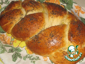 Поставить косу в духовку, на дно плашку с холодной водой и выпекать 10-12 минут при 230 С, затем воду убрать, температуру снизить до 180 и допекать еще 10-15 минут.
