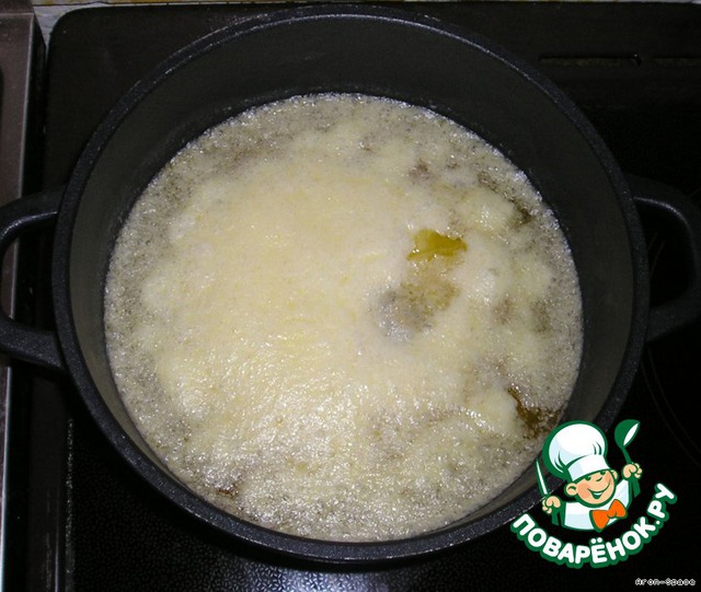 Теперь поставьте кастрюлю на плиту, включите СРЕДНИЙ огонь и растопите масло. Изредка и очень аккуратно помешивайте масло, чтобы оно таяло равномерно.