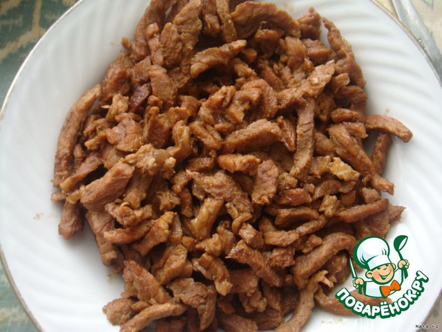 Для начала займемся мясом, режем как на бефстроганов, немного тоньше, примерно 4-5 см в длину, кладем на смазанную растительным маслом сковороду, накрываем крышкой, не солим! мясо будет вариться в соку, как будет мягкое, открываем крышку, и немного поджариваем, добавив соевый соус совсем немного или солим. Также можно поджарить с луком, нарезанным полукольцами и немного чеснока для запаха. Я добавляю просто соевый соус. Все, мясо готово!