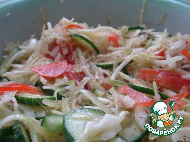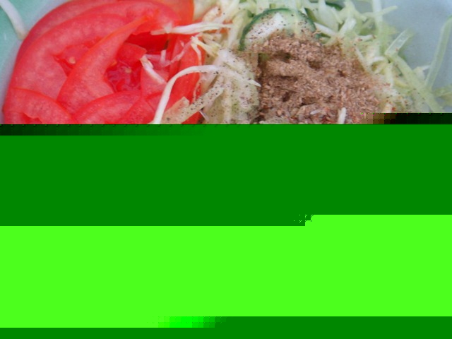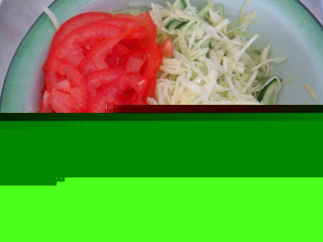 Еще одна составляющая-салатик. В сезон можно добавить баклажаны и перец болгарский, но я всегда делаю почему-то так:капусту шинкую тонко, солю немного, сахарю, брызгаю уксусом немного, мну руками.