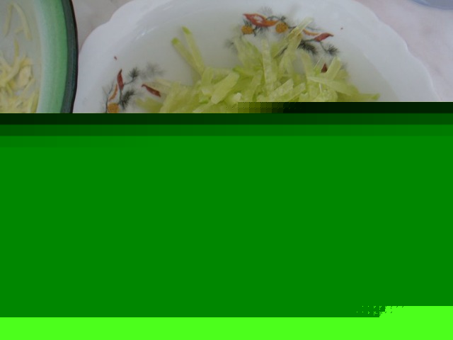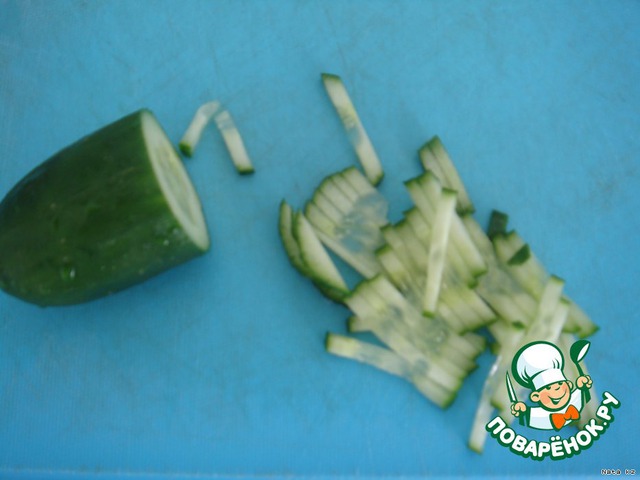 Режем огурец тонкими полосочками, как спички, примерно половинку от среднего огурца и тоже в баночку его. -