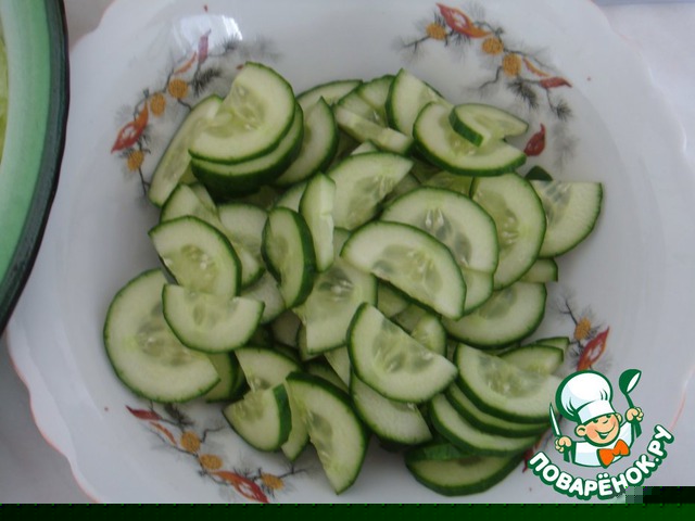Огурец нарезать тонкими полосками или полукольцами, добавить к капусте.