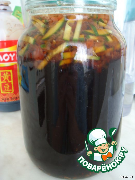 Теперь очередь так называемой заливки, берем литровую банку или что-то другое и начинаем шаманить, добиваясь приятного для вас вкуса :). Наливаем воду (кипяченую холодную или минералку или отфильтрованную), добавляем туда 2-3 стол ложки соевого соуса, у меня вот такой. Лучше чего-то не доложить сначала, а потом добавлять.