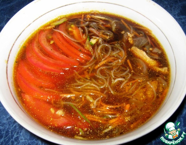 Хочу показать вам свой вариант приготовления этого замечательного блюда, только вот не знаю это первое или второе? Наверно что-то среднее... Раньше кушали в корейских кафешках, а сейчас дома готовлю, только делаю не слишком остро, попробуйте, можно употреблять холодным и горячим.