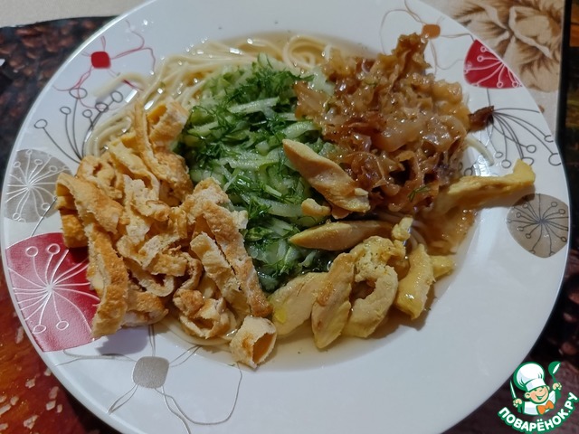 В глубокую тарелку кладем лапшу, размешиваем нашу заливочку, наливаем сверху, потом на это все дело выкладываем мясо, рядом омлетик и салатик! Вот и все, это не долго! Приятного аппетита!