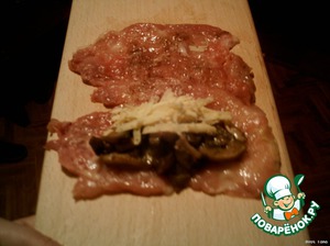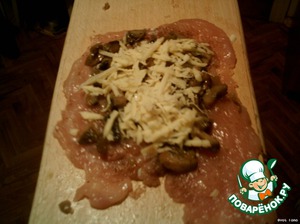 На бедрышко выкладываем грибы и сыр. Заворачиваем рулетик.