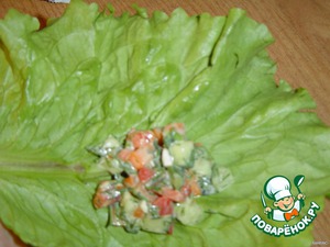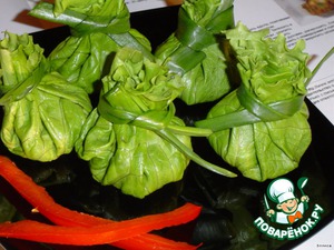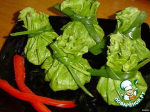 Я очень благодарна поваренку ТАТРА за чудесную идею с мешочками из салатных листьев - https://www.povarenok.ru/recipes/show/20685/.Это вариант таких мешочков,только с другой начинкой.С этой начинкой вкус получается просто обалденный!!!