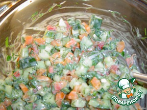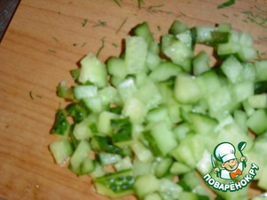 Такими же мелкими кубиками нарезаем огурец.