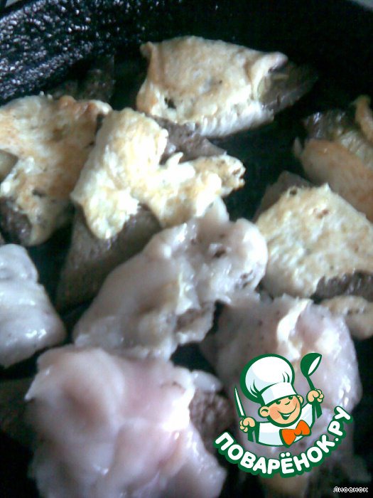 Рецептик из любимого раздела "Утилизация". делала ревизию в холодильнике и обнаружила немного печени говяжьей и половинку куриного филе. Из такого набора родилось недурственное блюдо, под таким вот незамысловатым названием.