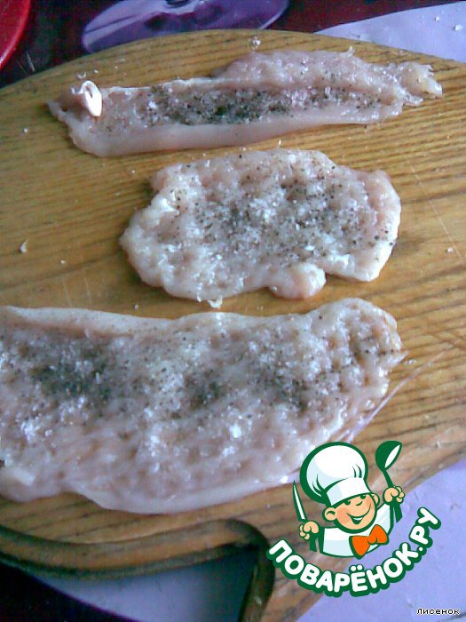 куриное филе порезать пластинками и отбить,посолить,поперчить.Большие кусочки я разрезала на полоски.Кусочков должно быть столько же,сколько и кусочков печени.
