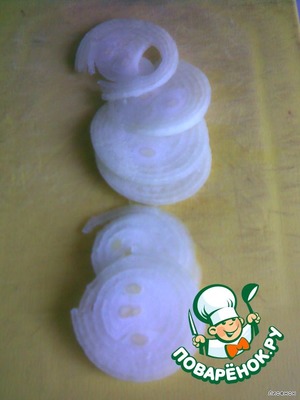 лук порезать кольцами(колечек столько же,сколько кусочков печени)