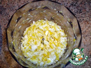 Форму я застелила пленкой - чтобы легче было достать заливное. Влить несколько стловых ложек "заливки" и отправить на 5-10 минут в холодильник.