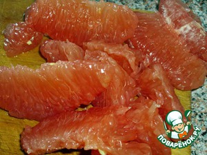 Затем, разложить поочередно ломтики курицы и грейпфрута. Влить оставшуюся "заливку" и поставить в холодильник до полного застывания.