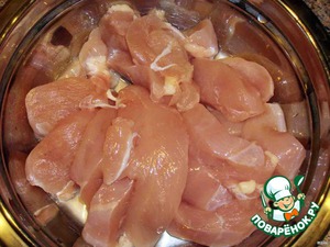 Чеснок измельчить, базилик промыть и разобрать на листитки (если свежий). Смешать в миске лимонный сок, оливковое масло, чеснок, лимонную цедру базилик. Положить ломтики мяса в миску, перемешать, накрыть и оставить в холодильнике часика на 2 (можно больше).