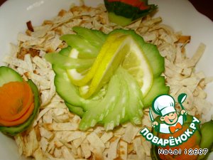 Нарезать армянский лаваш на тонкие полоски и обжарить на сухой сковородке, постоянно помешивая до сухариков. Выложить их на салат. Украсить по вашему усмотрению! Приятного аппетита!!!!!!